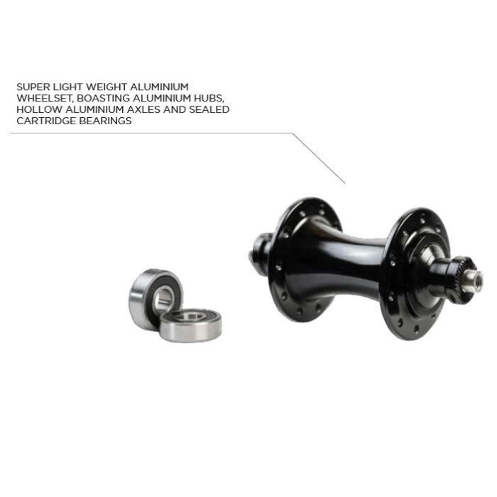 - Lightweight and durable aluminum wheels with aluminum hubs, hollow aluminum axles and sealed ball bearings