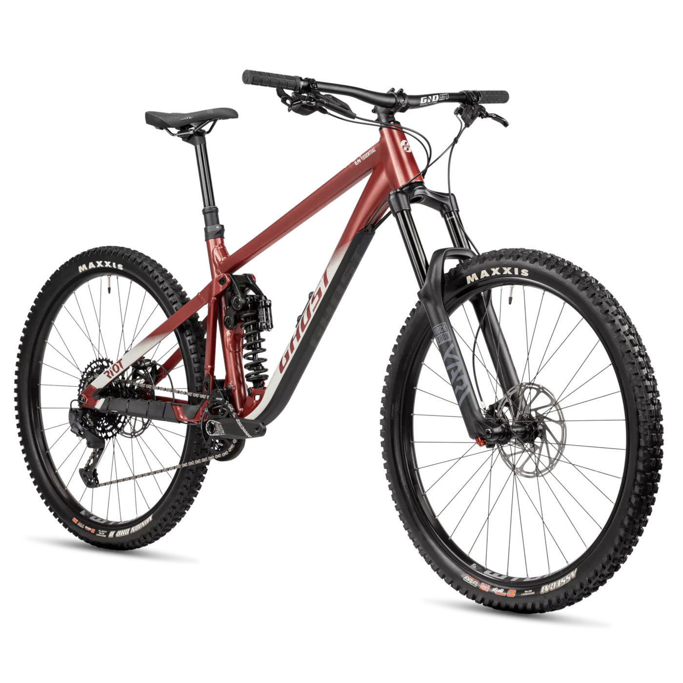 Fact Sheet of Ghost RIOT ENDURO Essential – Mountain Bike – 2023 – metallic rust red / dust matt Product Name: Ghost RIOT ENDURO Essential – Mountain Bike – 2023 – metallic rust red / dust matt Manufacturer: Ghost Bikes Item Code: GOS608803 activity: Cycling gender: men material: Aluminium usage bikesport: MTB, Enduro hubs: Shimano HB-MT400-B 15×110 mm, Shimano FH-MT400-B 12×148 mm spokes: DT Swiss 2.0 rims: WTB ST i30 chain: SRAM GX Eagle cassette: SRAM PG-1230 rear derailleur: SRAM GX Eagle, 12-speed bottom bracket: SRAM DUB, BSA 73 chainring ratio: 32 crankset: Truvativ Descendant 6K Eagle X-Sync brakes: SRAM Code R 200mm, Rotor SRAM Centerline 200 mm seat post model: Ghost Alpha 1 34.9mm, 125 (S), 150 (M), 170 (L/XL) saddle: WTB Volt handle bar: Ground Fiftyone, 31.8mm, 760/15 (S), 780/25 (M-XL) stem: Ground Fiftyone, 31.8mm fork: Rock Shox Yari RC, 170 mm headset: Acros Blocklock 135° AZX-582 frame: RIOT AL groupset: SRAM gear ratio: 11-50 number of gears – front: 1 shifting system: 12-speed shifting actuation: Mechanical brake type: Disc Brake wheel size: 27, 5" / 650B (584mm), 29" (622mm) bike special accessories: Chainguide MRP AMg grips: WTB Wafel shock: Rock Shox Super Deluxe Coil Select R, 160mm seatpost: Dropper post frame type: Full Suspension travel fork: 170mm ASTM: Category 4 tires: Maxxis Assegai 3C MaxxGrip Exo+ 2.5 (S 27, 5"; M-XL 29"), Maxxis Minion DHR II 3C MaxxTerra Double Down 2.4 (S 27, 5"; M-XL 29") brake actuation: Hydraulic Model year: 2023 Collection: Full year Color: Brown fork construction: Classic Suspension Fork manufacturer item code: 31RI8 cable routing: internal Manufacturer page: http://www.ghost-bikes.com/