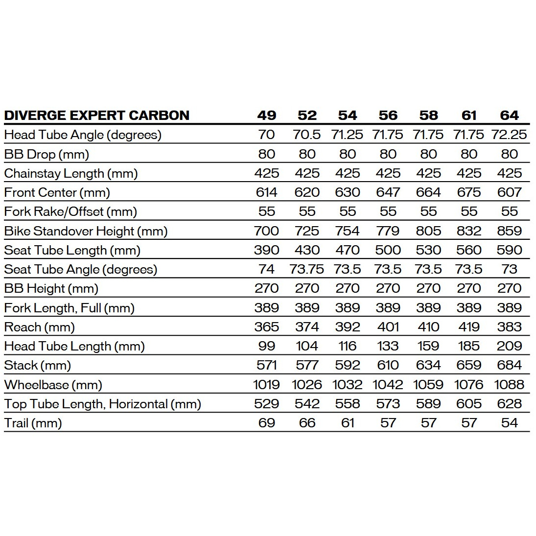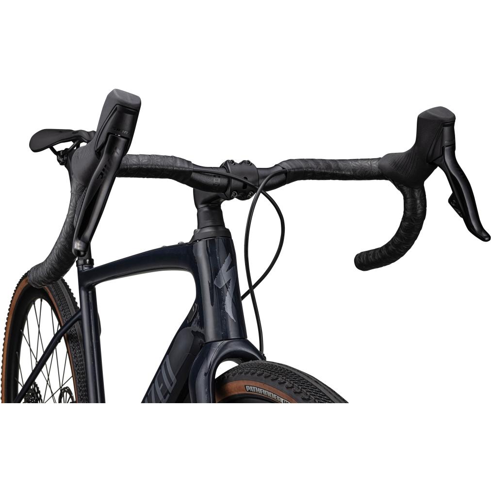 Fact Sheet of Specialized DIVERGE EXPERT – Carbon Gravel Bike – 2024 – gloss dark navy granite over carbon / pearl Product Name: Specialized DIVERGE EXPERT – Carbon Gravel Bike – 2024 – gloss dark navy granite over carbon / pearl Manufacturer: Specialized Bikes Item Code: SBC668134 activity: Cycling gender: men material: Carbon usage bikesport: Allroad / Gravel hubs: DT Swiss 370 spokes: DT Swiss Comp Race rims: Carbon Clincher, Tubeless Ready, 25-622 chain: SRAM GX Eagle cassette: SRAM NX Eagle shifter: SRAM RIVAL ETAP AXS rear derailleur: SRAM GX Eagle AXS bottom bracket: SRAM DUB BSA 68 chainring ratio: 40 crankset: SRAM Rival 1 brakes: SRAM Rival eTAP AXS wheels: Roval Terra C seat post model: Roval Terra Carbon, 20mm Offset saddle: Body Geometry Power Expert bar tape: Supacaz Super Sticky Kush handle bar: Specialized Adventure Gear Hover, 103mm Drop, 70mm Reach, 12° Flare stem: Future Stem Pro fork: Future Shock 2.0, FACT Carbon frame: Specialized Diverge FACT 9r Carbon, Future Shock, SWAT groupset: SRAM AXS (electronic) gear ratio: 11-50 number of gears – front: 1 shifting system: 12-speed shifting actuation: Electronic brake type: Disc Brake wheel size: 28" (622mm) seatpost: Seatpost rigid tires: Pathfinder Pro 2BR, 42-622 brake actuation: Hydraulic Model year: 2024 Collection: Full year Color: Black fork construction: Single Shock weight: 9250g manufacturer item code: 95423-3149 cable routing: internal Weight Source: Manufacturer Weighed Version: 56 Manufacturer page: http://www.specialized.com